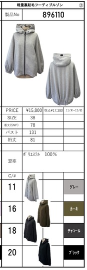 ご予約 Ayane 896110 軽量裏起毛フーディブルゾン