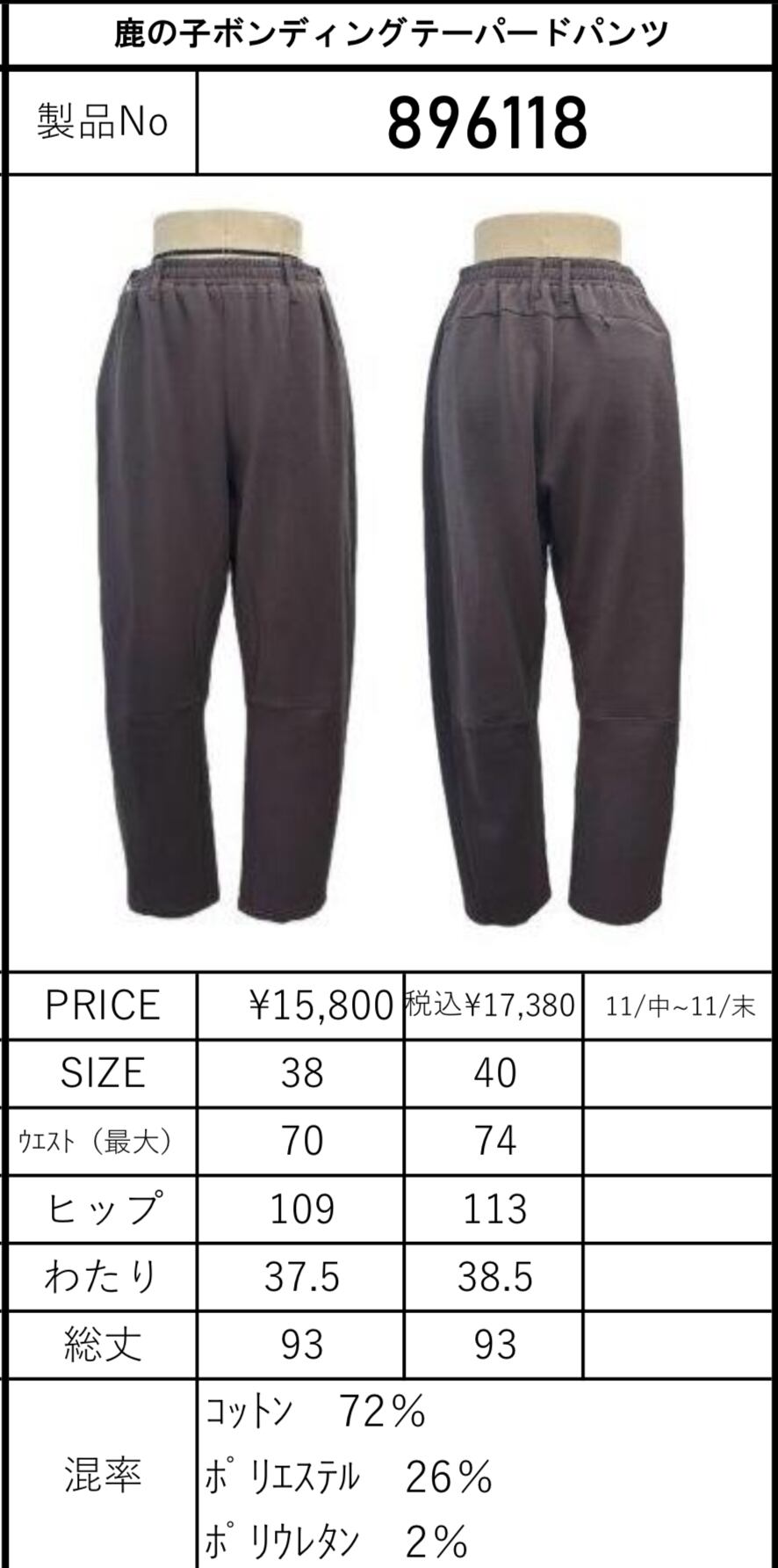 ご予約 ayane 896118 鹿の子ボンディングテーパードパンツ